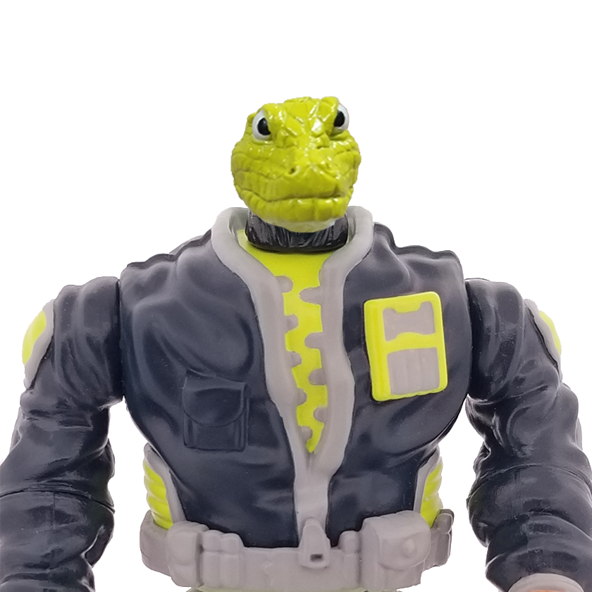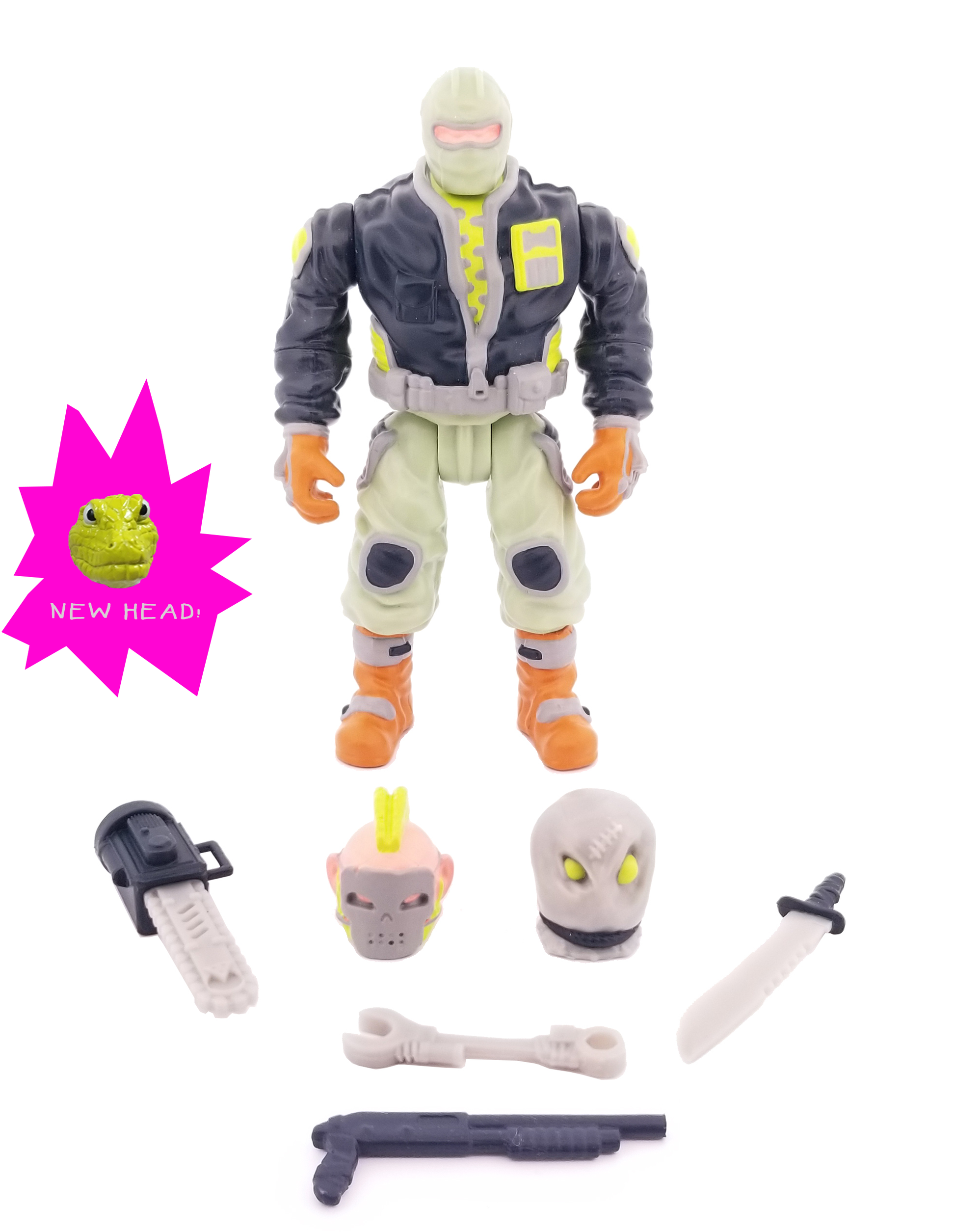 Includes all of the normal Hackerman accessories, as well as a new painted lizard head AND a second neck convertor piece (color may vary). Yes, I forgot to photograph the biker helmet....but it is included.